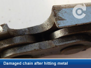 Worn drive sprocket or bar rails have been dressed below minimum height.