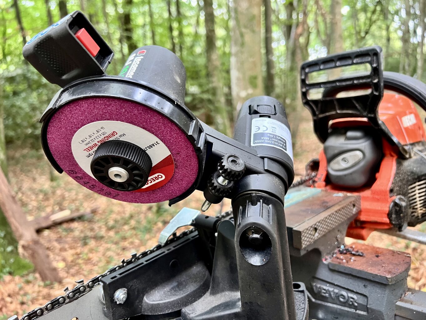 It’s light, easy to use, fast, accurate and reatively cheap. Battery lasts for let’s say 20 sharpens of a 20″[50cm] chain. Range of disc options.