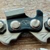 New Panther + chain [patent pending]. The + stands for additional line markings on the top plate of the tooth which helps give a visual guide to the angle you are sharpening at but more importantly it helps you judge the tooth length in relation to the other teeth on the chain. One of the hardest things to do with a chainsaw chain [without a guide] is to ensure each tooth is the same length and the same angle as all it’s brothers. If not cutting becomes inconsistent, vibration increases, the teeth that are longer take big bites of the wood and dull faster.